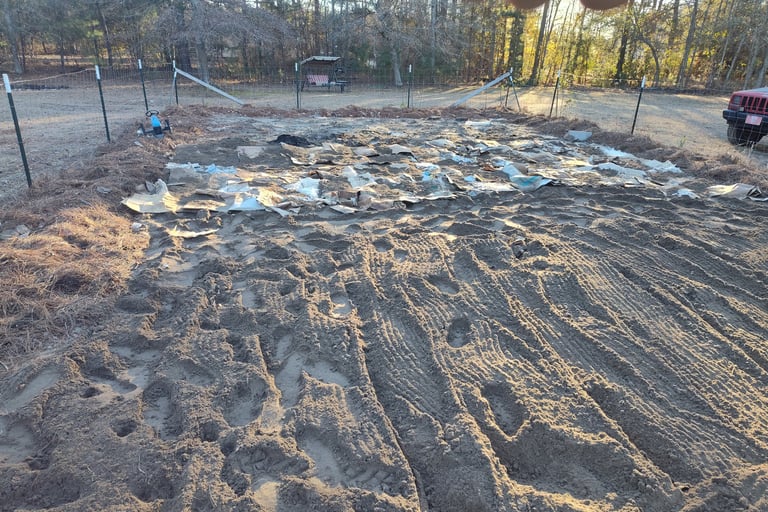 We have a layer of cardboard on the sand. Yeah, we have sand not dirt! Then a layer of leaves. About 4-5 inches thick. Over that we’re going to put rows of brown parcel paper, and on those raised beds of bought topsoil and compost. In between the rows we'll put down more paper and wood chips. The long-term idea is to have that decompose of the next couple of years and eventually have proper soil. Without spending a fortune.