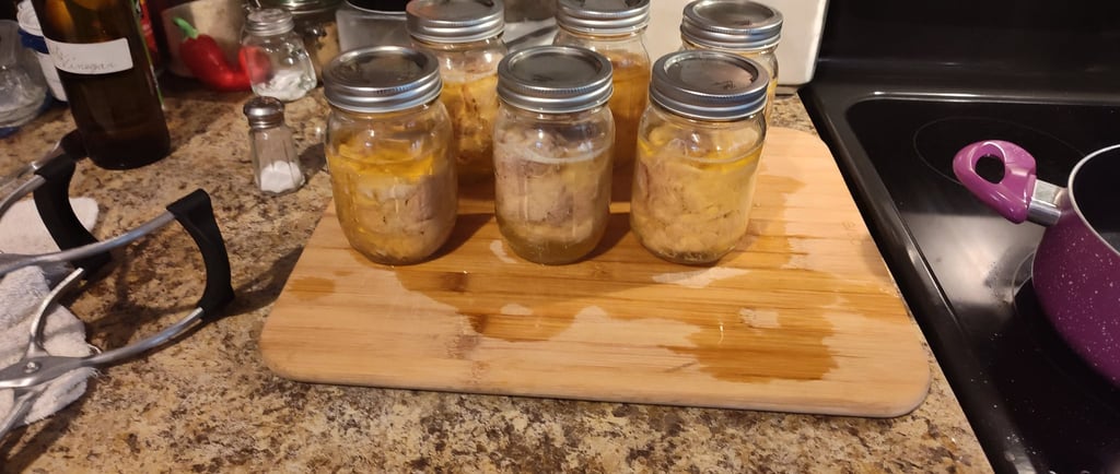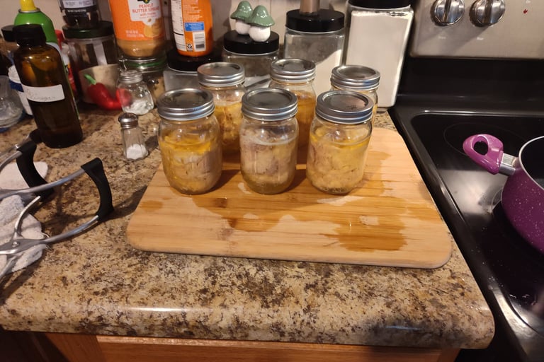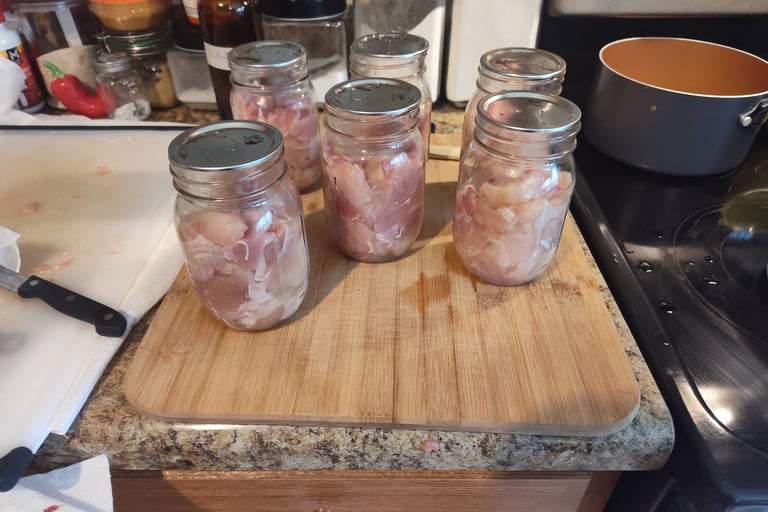 Once 90 minutes is up turn off the heat and let the pressure drop on its own. Remove the jars and put them on a towel on the counter. If you put the hot jars on a cold counter they can shatter. And it's not fun with hot glass and boiling chicken flying about. Doing this on an electric stove it reminds me of my grandmother canning on her wood burning range. Having to move the canner around to maintain temperature, The pressure is VERY important. To low of a pressure can leave harmful bacteria which at the least make you sick. Or kill you. Pressure canning is not the mystery or danger that people think. It preserves foods that need no refrigeration and with proper storage keeps them good to eat for a very long time. Web versions of The USDA Canning guide or The Ball Mason Jar Canning guide are valuable tools to have on hand.