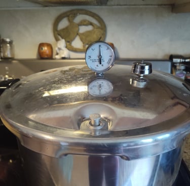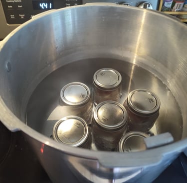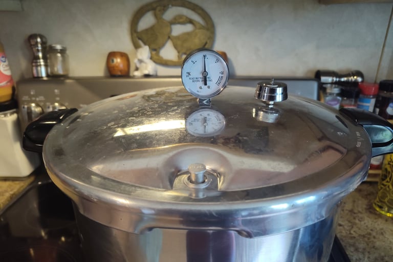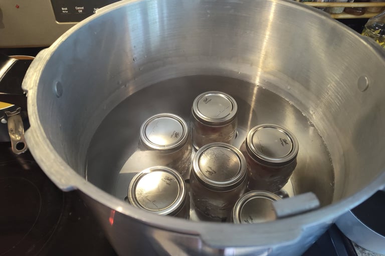 Once you put the jars in make sure there is about an inch of water over the top of the jars. To little and the jars may not seal. To much and it might cause splashing or excessive steam, potentially leading to a decrease in the water level during the processing time. This may lead to the jars ending up uncovered and not fully processing leading to unsafe food. Seal it up and turn the heat on until steam is coming out the vent. This pushes out oxygen and fills the canner with steam. Then put the weight on and start the timer when it hits 11 lbs per sq inch.