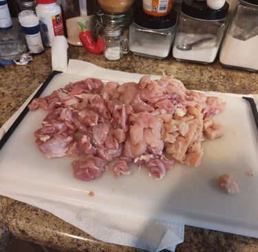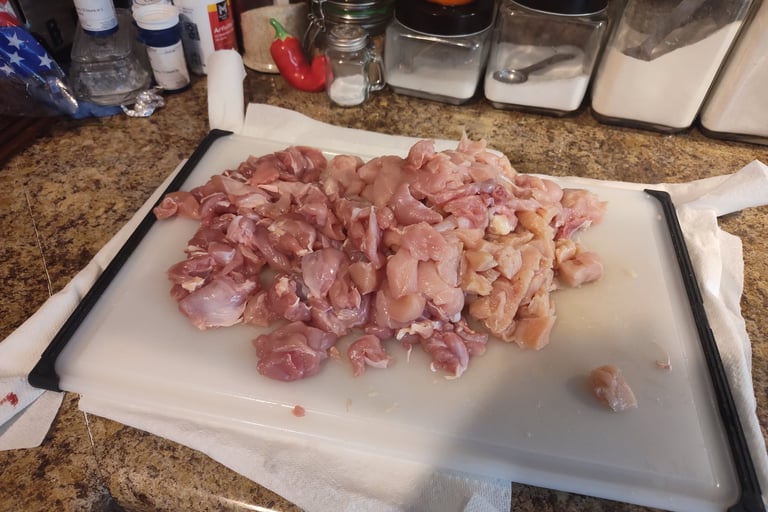 De-bone the chicken and make sure to removed tendons cartilage and excess fat. Cut the chicken in to about ¾ to 1 inch pieces. This makes it easier to pack in the jars, and get out again.