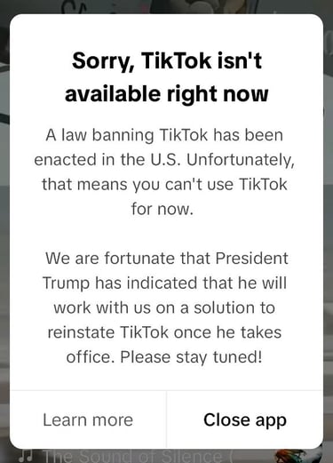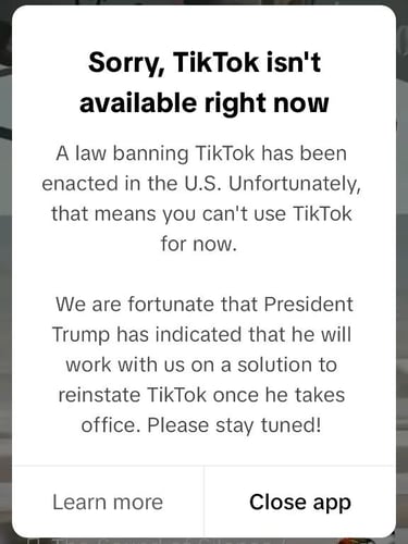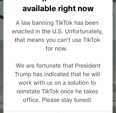 “A law banning TikTok has been enacted in the U.S., Unfortunately, that means you can’t use TikTok for now. We are fortunate that President Trump has indicated that he will work with us on a solution to reinstate TikTok once he takes office. Please stay tuned!”