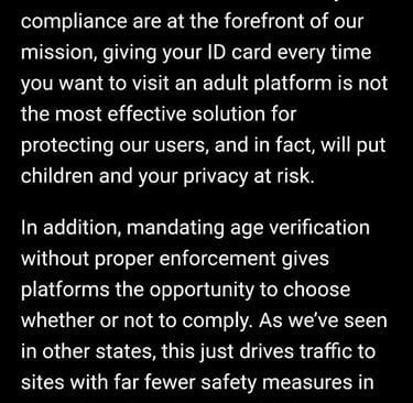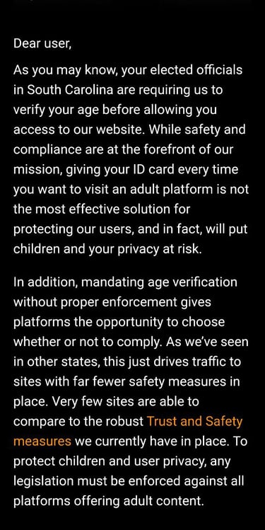As you may know, your elected officials in South Carolina are requiring us to verify your age before allowing you access to our website. While safety and compliance are at the forefront of our mission, giving your ID card every time you want to visit an adult platform is not the most effective solution for protecting our users, and in fact, will put children and your privacy at risk.