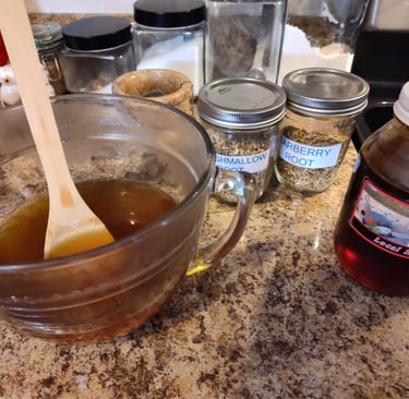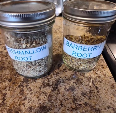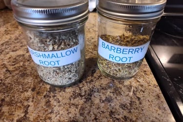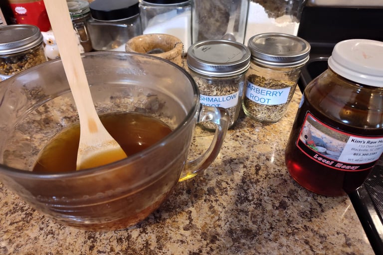Barberry and its relative Oregon Grape Root have a chemical called Berberine. Berberine is an isoquinoline quaternary alkaloid, and medical studies has shown it to be a promising antibiotic adjuvant due to its ability to enhance the effectiveness of conventional antibiotics against drug-resistant bacterial strains. (Dove Press) That is why I choose the Barberry root. The marshmallow root contains mucilage, that coats the throat and helps soothe the throat lessening pain. And the Chamomile is a twofold. First it's well known that a cup of Chamomile tea before bed helps to relax you a bit and encourage good sleep. And what not as many people know it has anti inflammatory properties that may help bring down the swelling. This helps with swallowing and getting the rest needed. Honey of course, to first help make this taste better, barberry is bitter, and honey itself has huge antimicrobial properties. NOTE In keeping with the FDA warnings, it is not recommended to give raw honey to babies and young toddlers. I have to say that!