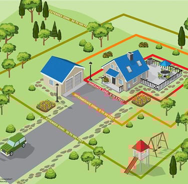 Zone 0: This zone extends 5 feet from buildings, structures, decks, etc. It focuses on intense fuel reduction to protect against ember attacks. Use gravel, pavers, or concrete instead of combustible mulch, clear dead weeds, grass, and debris, and keep branches trimmed 10 feet away from chimneys and stovepipes.