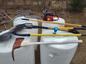 Here are pictures of our property , taken today 2 March 2025. As y'all can see we followed for the most part the defensible space around our homes. Where could to property lines. The parts we need to fix are the brush piles. While they are well outside of zone 3 and in zone 4 they can flare and spread embers. I need o get a chipper and get rid of them. While our neighbors burn their piles, being from the southwest, I have a hard time doing that! I need to clear under brush and fuels from the woods in our property lines and along the road.You can see sprinklers in the woods, but that is an emergency fix. I need to actually go out and gut that. All our fuels are stored in the connex. While we may lose whats in them, they wont catch the house. And I included a picture of our firefighting gear. I try to stay with fiberglass handles when I can. Our chain saw is a Dolmar PS510. Reason I bought a Dolmar 15 years ago is it was one of the few that still had a metal engine case. Most of the rest are polymer. Yeah it's heavier than a Sthil or Husky. (Both damn fine saws) it was just a selling point to me. And its an AWESOME saw! I have bars of 16, 18 and 20 inch length. For the most part I just use the 18" bar. And 2 chains for each bar. The Pulaski is one I bought years ago at a police and firefighter supply store in Albuquerque when I was a volunteer fire fighter and had my red and yellow cards.