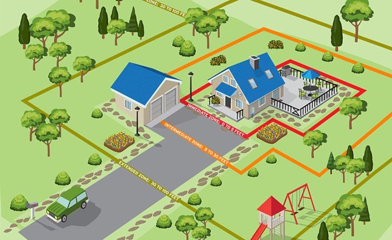 Zone 1: This zone extends 30 feet from buildings, structures, decks, etc., or to your property line, whichever is closer. Ensure outbuildings and LPG tanks have 10 feet of clear space to bare soil and no flammable vegetation within an additional 10 feet around them. Remove dead vegetation and other items from under your deck or porch, and within 10 feet of the house.